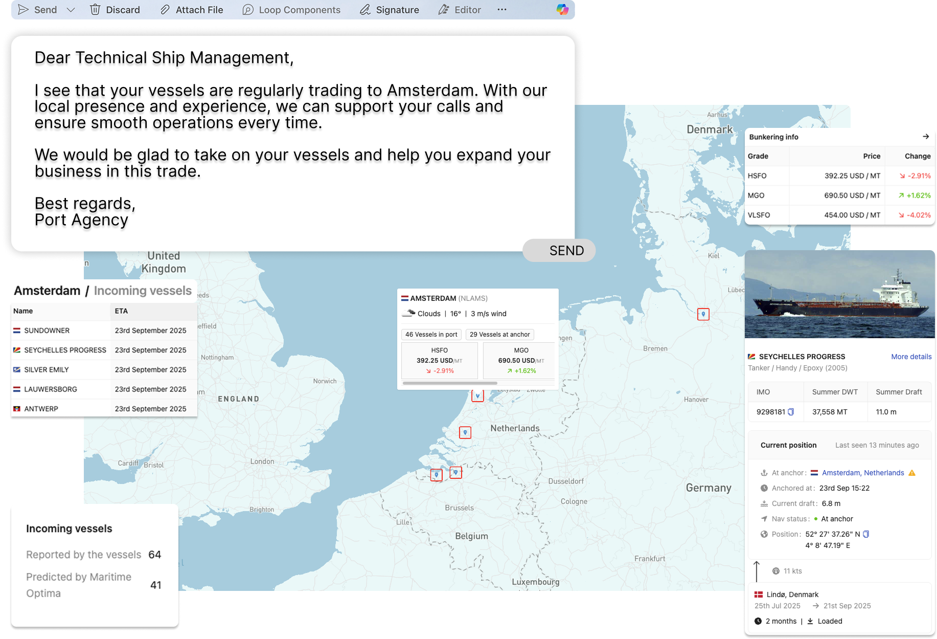 With your internal notes, files, and photos attached to vessels and ports, you can reach out at the right moment with proposals tailored to each potential client.