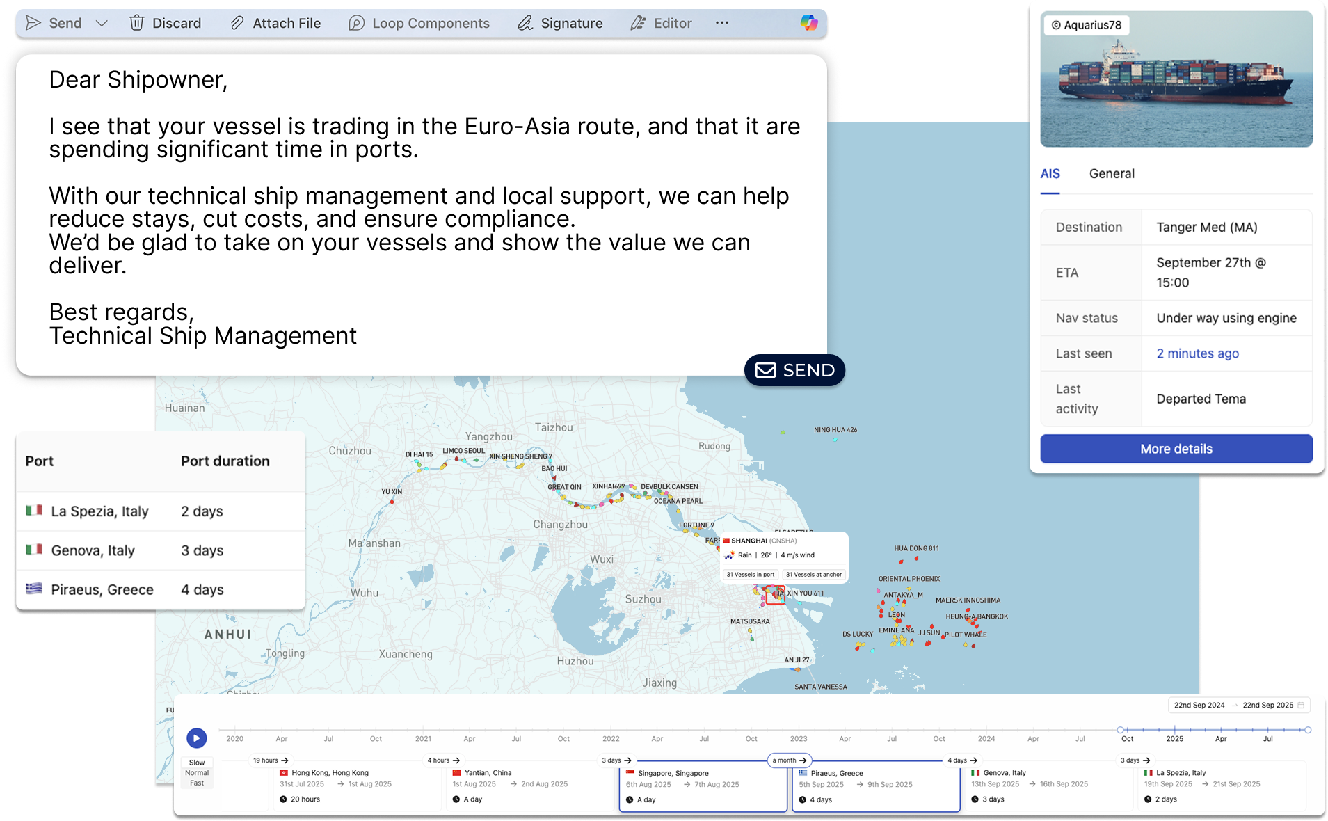 Link your contact book to vessel lists so you can reach out fast with tailored proposals based on operational insights.